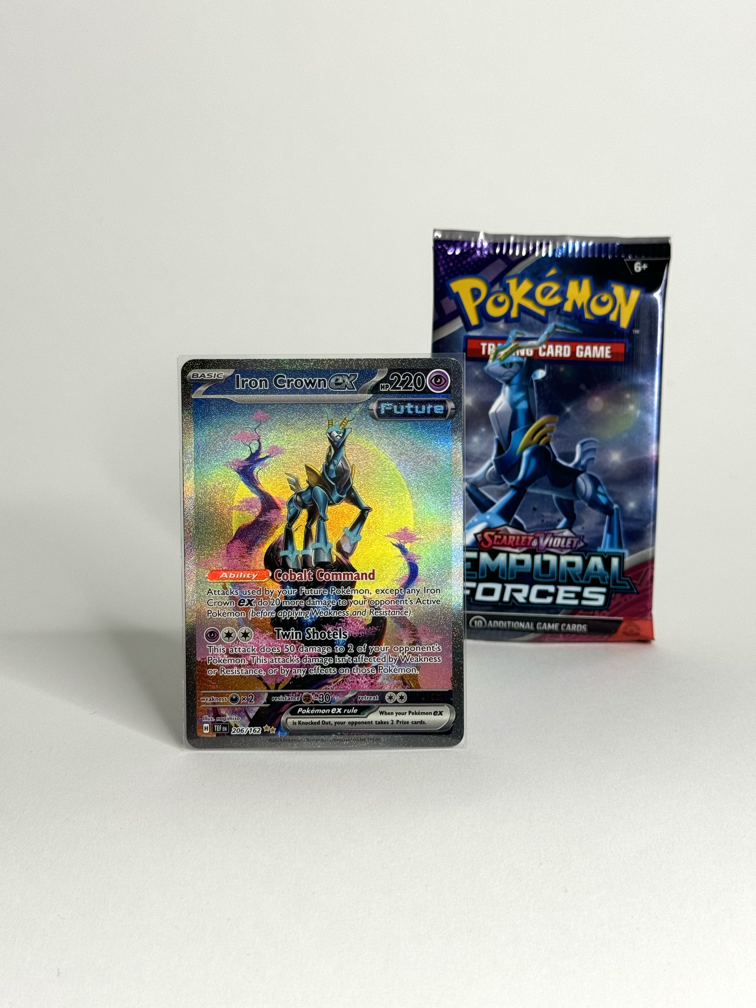 The ranks of Ancient and Future Pokémon continue to grow! Walking Wake ex breaks free of the past alongside Raging Bolt ex, while Iron Leaves ex delivers high-tech justice with Iron Crown ex. Outside Area Zero, Wugtrio and Farigiraf shift types as Tera Pokémon ex, and Pokémon Trainers everywhere prepare for the return of ACE SPEC cards with uniquely powerful effects. A rupture in time brings wild beasts and cyber visions to battle in the Pokémon TCG: Scarlet & Violet—Temporal Forces expansion!
