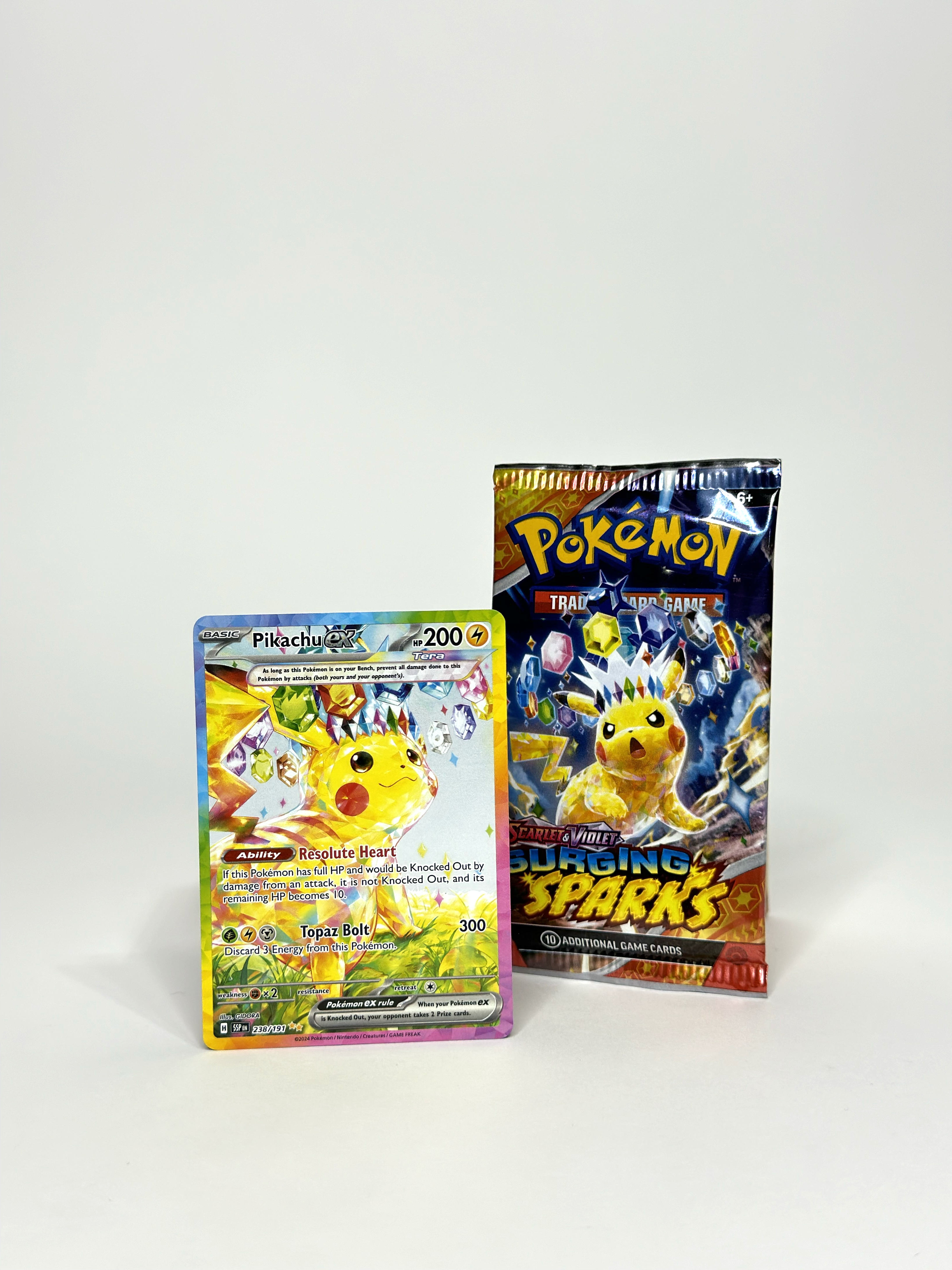 Terawatts of electricity crash down from the sky in a tropical paradise, setting the stage for the supercharged Pikachu ex! With the power of a Stellar Tera Pokémon ex, it lights up the shoreline, revealing a parade of dragon Pokémon led by the towering Alolan Exeggutor ex! Archaludon ex and Latias ex round out the horde, while new ACE SPEC cards and more new Pokémon ex bring surprises of their own. Currents crackle and dragons roar in the Pokémon TCG: Scarlet & Violet—Surging Sparks expansion!
